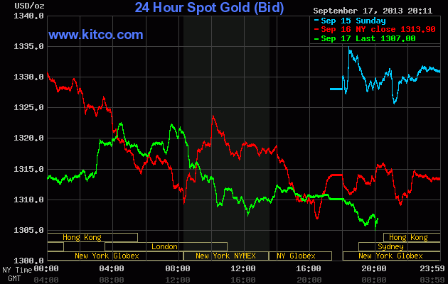 309 USD/ounce trong khi vàng kỳ hạn tháng 12 giảm 8,4 USD xuống 1. Khảo sát của Reuters và Bloomberg đều cho kết quả, Fed có thể cắt giảm quy mô gói QE khoảng 10 tỷ USD, tức từ 85 tỷ USD xuống còn 75 tỷ USD mỗi tháng. Ngoài ra, giá vàng phiên qua còn chịu áp lực giảm bởi Ấn Độ tăng thuế nhập cảng vàng trang sức sẽ kìm hãm nhu cầu trên thị trường vật chất. Bữa qua, Bộ Lao động Mỹ công bố bẩm cho thấy chỉ số giá tiêu dùng tháng 8 tăng 0,1%.